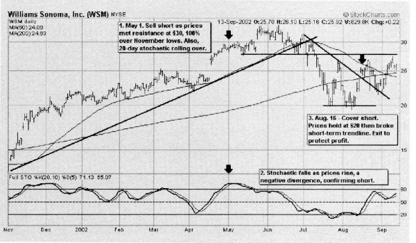 Рисунок 5-13. 1 мая Родз открыл короткую позицию по акциям компании Williams-Sonoma, работающей на рынке недвижимости, поскольку технически цена выглядела слабой после того, как удвоила свое значение с момента террористической атаки. Поначалу позиция ушла в минус, но понижающиеся вершины стохастического осциллятора убедили Родза оставить ее открытой. Через три месяца позиция принесла прибыль.