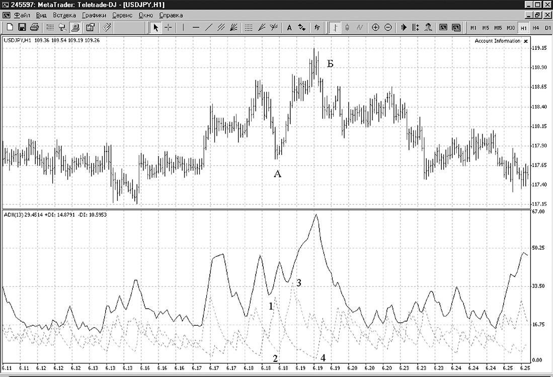 После достижения ценой максимума Б ситуация повторилась. Только в этот раз минимумов достигло значение – D (точка 4), а максимумов +D (точка 3). После чего движение вверх сменилось движением вниз. Следует обратить внимание на поведение ADX в области, соответствующей точке 4. ADX достиг здесь аномально большого значения. Это явилось сильным сигналом к тому, что тренд, на котором значение ADX достигло такой большой величины (тренд вверх – в данном случае до точки Б), близок к завершению. Методика оценки критических значений всех трех параметров, по достижении которых генерируется сигнал о смене тренда, будет описана в главе, посвященной осцилляторам.