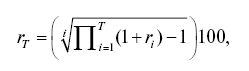 При сроках инвестирования более одного года показатели среднегодовой доходности по акциям и облигациям вычислялись по методу сложных процентов, как корень i-й степени из доходности, полученной за период инвестирования, в котором насчитывается i лет, по формуле: