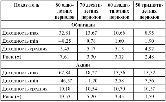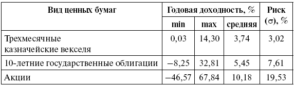 Как свидетельствуют представленные данные, при инвестировании сроком на один год средняя доходность акций более чем в 2 раза превосходила доходность государственных облигаций. Однако разброс доходности по данному инструменту составлял от —46,57 до 67,84 %, что характеризует более высокий рыночный риск акций, стандартное отклонение по которым равно 19,53 %. Вариация доходности облигаций значительно меньше. На основании этого в классической теории инвестирования акции рассматриваются как более рискованный финансовый инструмент по сравнению с облигациями, так как акции могут принести инвестору как высокий доход, так и существенные потери. Однако данное утверждение справедливо только при рассматриваемом сроке инвестирования, а именно, один год.