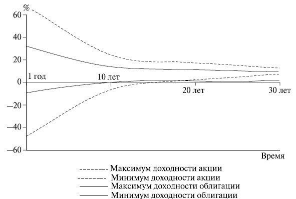 Рис. 8.6. Максимальные и минимальные доходности по акциям и облигациям на американском фондовом рынке в зависимости от длительности инвестирования