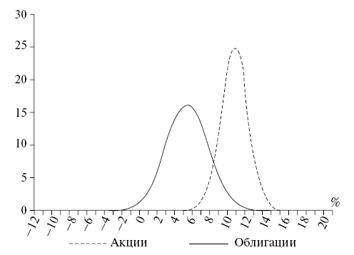 Рис. 8.7. График нормального распределения среднегодовой доходности акций и облигаций на американском фондовом рынке при инвестировании сроком на 30 лет