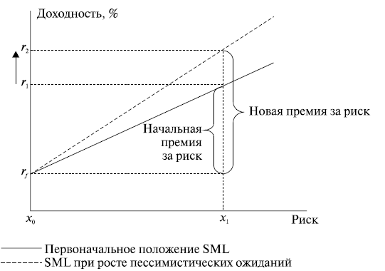 Если несклонность инвесторов к риску возрастает, угол наклона линии рынка ценных бумаг увеличивается. Эта ситуация возникает, когда на рынке превалируют пессимистические прогнозы, и инвесторы при заданном уровне риска требуют большей премии за риск. На рис. 8.8 показано изменение положения SML относительно первоначального положения при росте несклонности инвесторов к риску.