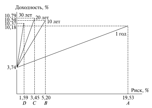 Рис. 8.9. Положение линии рынка ценных бумаг при разных временных горизонтах инвестирования