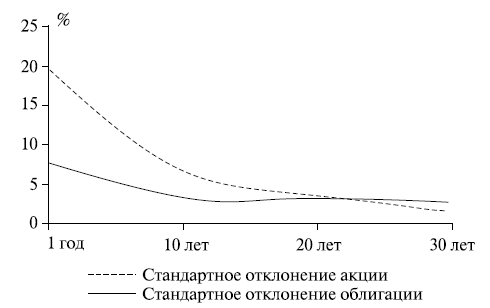 Рис. 8.10. Изменение стандартного отклонения доходности по акциям и облигациям на американском фондовом рынке в зависимости от длительности инвестирования