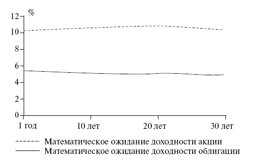 Рис. 8.11. Математическое ожидание доходности по акциям и облигациям на американском фондовом рынке в зависимости от длительности инвестирования