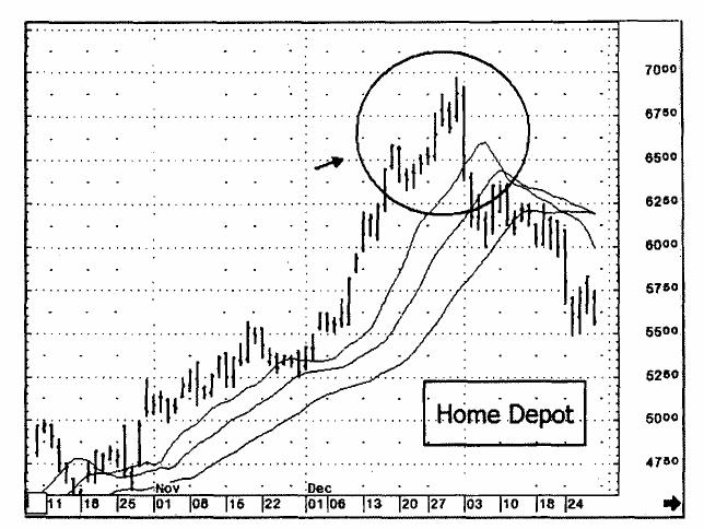 Важно осознавать, что не каждое восходящее или нисходящее движение дает бар медвежьего или бычьего разворота. Взгляните на дневной график Home Depot на Рисунке 9-13. Ни один из баров на вершине этого движения цены не был баром медвежьего разворота. Если бы мы задумывались об открытии короткой позиции или оказались на этом рынке в ситуации "стоп-разворот", мы использовали бы другие сигналы Profitunity и технические приемы, которые описаны в двух наших предыдущих книгах "Торговый хаос" и "Новые измерения рынка", и которые мы преподаем в домашнем учебном курсе Profitunity Home Study Course.