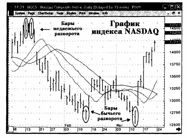 Этот график иллюстрирует, что не всегда в конце каждого движения бывает бар бычьего или медвежьего разворота. Мы ищем их и действуем в соответствии с ними, когда они появляются. Восходящее движение на этом график Ноmе Depot закончилось без того, чтобы какой-либо из обведенных кружком баров оказался медвежьим баром разворота.