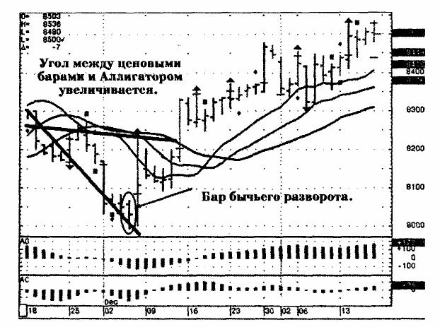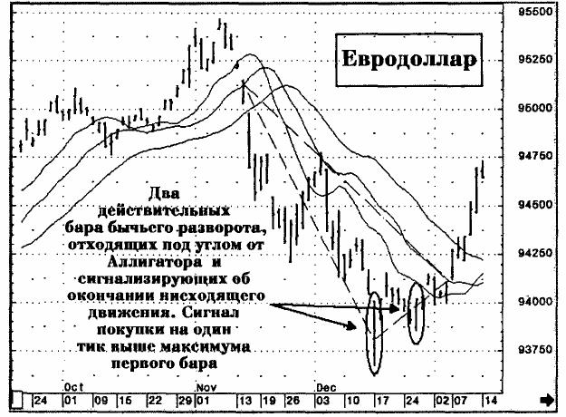 Когда мы смотрим на действительный сигнал бара бычьего разворота на графике евродоллара (Рисунок 9.12), мы замечаем, что первый обведенный кружочком бар бычьего разворота явно отходит под углом от Аллигатора и поэтому является сигналом нашего входа. Через несколько дней появился еще один бар бычьего разворота, который не может быть признан имеющим силу, потому что между ним и Аллигатором не было ангуляции. Но неважно, мы уже открыли эту прибыльную сделку. Вы можете также обратить внимание на бар бычьего разворота в районе 26 ноября (почти на полпути движения вниз). Этот сигнал также не имел силы и не мог считаться индикатором, потому что не было ангуляции между ним и Аллигатором.