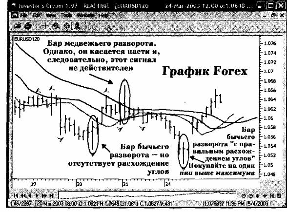 Следующий график, Рисунок 9-9 - это Forex (Foreign Exchange - рынок иностранных валют). На левой стороне находится бар бычьего разворота, обведенный кружочком, но как вы можете видеть, имеет место небольшая или совсем никакая ангуляция, поэтому мы его не берем. Через семь баров появляется бар медвежьего разворота, имеющий контакт с Аллигатором, и следовательно, мы также не будем брать этот сигнал продажи. Далее на правой стороне графика примерно 29 числа месяца появляется имеющий силу бар бычьего разворота, потому что он имеет ангуляцию. Следовательно, мы можем взять этот сигнал и купить на открытии с разрывом на следующий день, создавая еще одну прибыльную сделку.