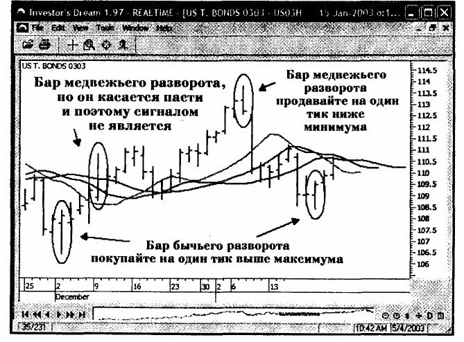 3 декабря на левой стороне графика облигаций (Рисунок 9-8) появился бар бычьего разворота с ангуляцией, следовательно, вы могли покупать на один тик выше максимума. 10 декабря имел место бар медвежьего разворота, который, однако, не был действительным, потому что не было ангуляции. Однако 7 января появился имеющий силу бар медвежьего разворота, которым следовало воспользоваться, потому что он имел ангуляцию. В конце января появился еще один бар бычьего разворота с ангуляцией. Вы могли развернуться в верхнюю сторону, опять же, потому что это был имеющий силу сигнал бара бычьего разворота.