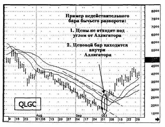 Дневной график QLGC (Q Logic Corp.) на Рисунке 9.11 напоминает нам, что не все бары бычьего разворота являются законными сигналами. Обведенный кружком бар бычьего разворота имеет две проблемы: (1) цены не отходят под углом от Аллигатора (см. пунктирные линии на графике) и (2) ценовой бар пробивает Аллигатор. Этот сигнал не действителен, несмотря на последующий разворот цены в верхнюю сторону.