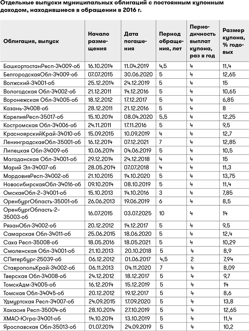 Наряду с Правительством Российской Федерации облигации могут выпускать и местные власти субъектов нашей страны, например правительство Республики Башкортостан или правительство Белгородской области. Такие облигации называются муниципальными. При их покупке все обязательства перед покупателями по выплате купонов и погашению облигаций берут на себя соответствующие региональные власти. В приведенной ниже таблице перечислены некоторые выпуски муниципальных облигаций, которые находились в обращении на российской бирже в 2016 г.16