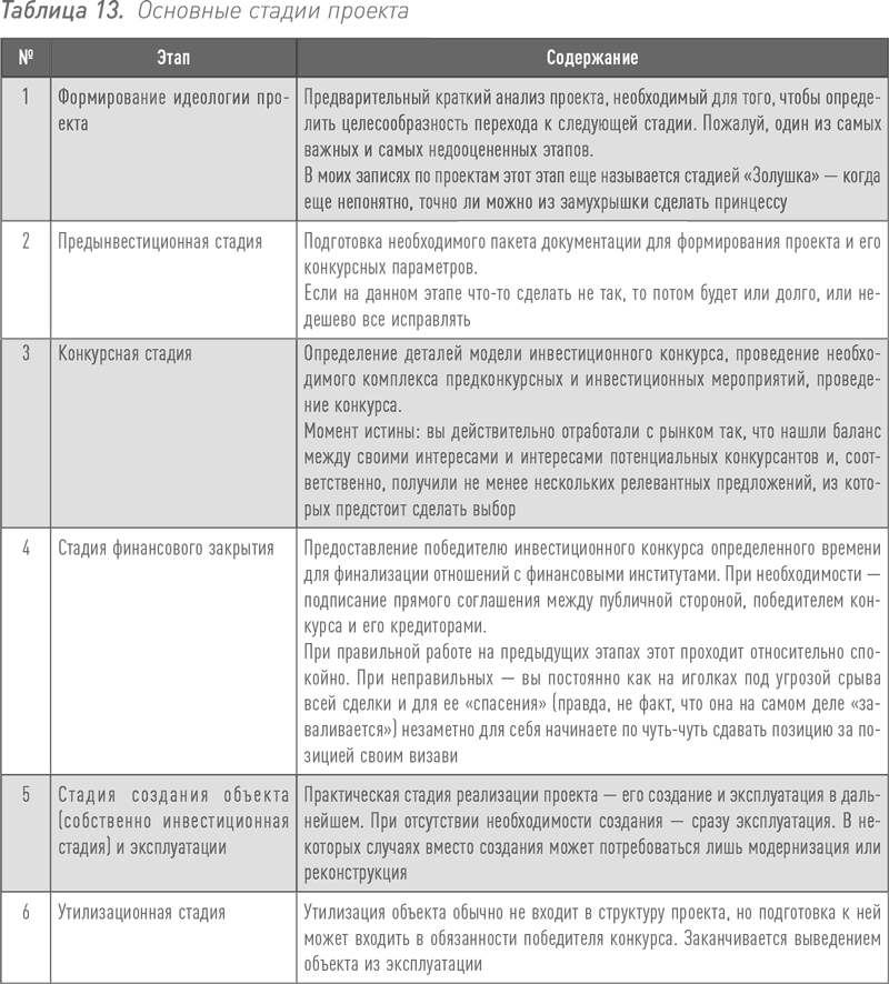 Существует значительное количество различных классификаций основных этапов проектов, принятых в зарубежной практике. Вместе с тем очевидно, что стоит опираться на подходы, сложившиеся в последние годы в России. Только на практике можно получить более точное понимание скрытых от глаз деталей этапов проекта, которые лучше соответствуют нашим реалиям, а не учебным теориям. Краткое описание его основных стадий и их содержания перечислено в таблице 13.