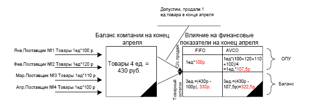 Природа FIFO и AVCO методов кроется в потоке входящих цен от поставщиков (закупки сырья/товаров) и влияния колебания цен на себестоимость продаж (в зависимости от выбранной учетной политики), а, следовательно, и стоимостную оценку товарных остатков в балансе. Ниже это проиллюстрировано[9]