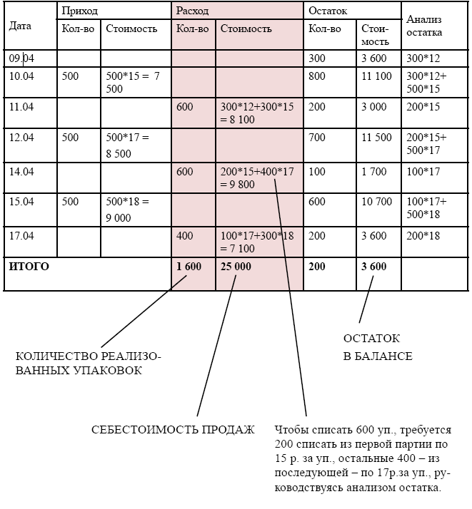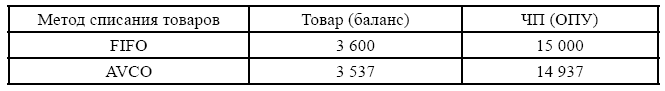 Таким образом, метод списания на себестоимость влияет лишь на стоимостную оценку балансовых показателей (в части товарных остатков) и показатель Чистой прибыли (в части себестоимости продаж). Количество (проданного и оставшегося), при этом, соответствует фактическому.