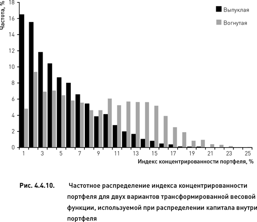 Использование вогнутой весовой функции для распределения капитала внутри портфеля изменило принципиальным образом форму распределения индекса концентрированности капитала (сравни левый средний график рис. 4.4.7 и рис. 4.4.10). В этом случае трансформация весовой функции привела к почти равномерному распределению индекса концентрированности. С частотой приблизительно равной 4–6 % случаев половина капитала инвестировалась в 1 % комбинаций, 2 % комбинаций и так далее до порядка 18 % комбинаций.