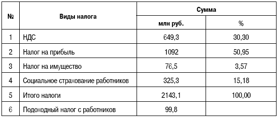 По расчетам, общая сумма налогов, поступающая в бюджеты всех уровней, составила 2242,9 млн руб., в процентах от инвестиционных затрат 50,25 %, основную долю в налогах составляют НДС 30,3 % и налог на прибыль 50,95 %.