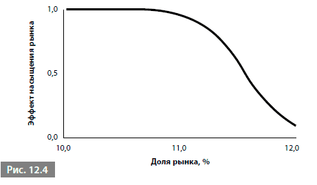 Посмотрите на рис. 12.4. На этом графике показано, как эффект насыщения рынка меняется вместе с долей рынка. Когда доля рынка составляет около 10 %, эффект насыщения рынка равен примерно 1,0, но, когда доля рынка возрастает до более чем 11 %, эффект насыщения рынка резко падает, приближаясь к нулю.