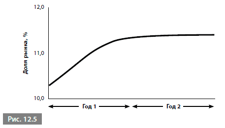 Доля рынка стабилизируется на отметке примерно 11,4 %. Расти выше этой суммы невозможно, так как на «покупку» клиентов по нарастающей требуются очень большие суммы. Однако в целом бизнес довольно прибыльный, он приносит устойчивый доход около ?5 000 000 в год (рис. 12.6).