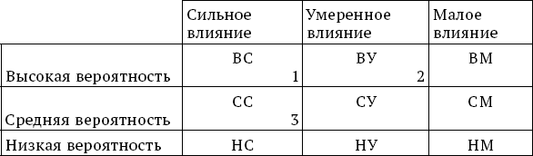 Вероятность наступления возможностей дифференцируется по трем степеням – высокая, средняя и низкая. Также классифицируются степени влияния: сильное, умеренное, малое. В результате образуются девять полей: ВС (высокая вероятность – сильное влияние), ВУ (высокая вероятность – умеренное влияние), ВМ (высокая вероятность – малое влияние), СС (средняя вероятность – сильное влияние), СУ (средняя вероятность – умеренное влияние), СМ (средняя вероятность – малое влияние), НС (низкая вероятность – сильное влияние), НУ (низкая вероятность – умеренное влияние), НМ (низкая вероятность – малое влияние).