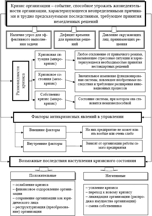 Кризис организации – это резкое обострение внутриорганизационных процессов и отношений с ее институциональной средой, ведущее к неплатежеспособности организации, и как следствие, к банкротству. Кризисные ситуации могут возникать на любой стадии деятельности организации как в период становления и развития, так и в период стабилизации и расширения производства и, наконец, при начале спада.