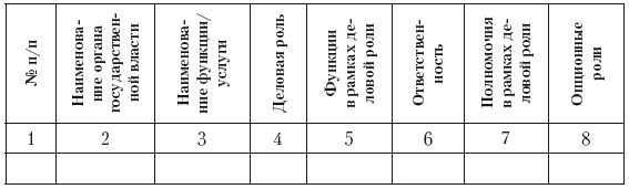 В некоторых случаях при реализации комплексных процессов возникает понятие «опционных ролей» – ролей по управлению структурой процесса, то есть те должности и штатные кадровые единицы, которые участвуют в процессах. Опционные роли формируются на основании имеющегося штатного расписания и распределяются по процессам исходя из нижеследующей формы (табл. 14)22.
