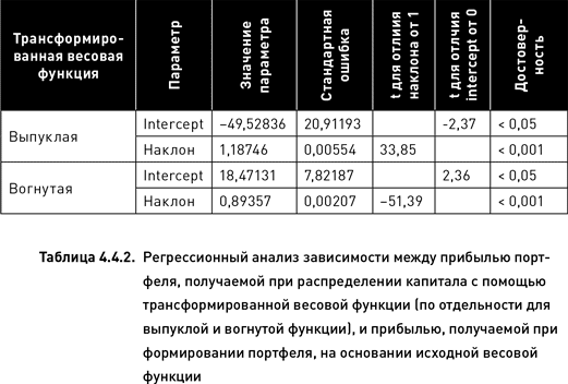Регрессионный анализ позволяет количественно выразить описанные наблюдения и проверить их статистическую достоверность. Коэффициент наклона линии регрессии равен 1,19, а коэффициент линии безразличия по определению равен 1. В таблице 4.4.2 приведены данные, доказывающие, что полученная разница угловых коэффициентов статистически достоверна на очень высоком уровне. Следовательно, вывод о том, что использование выпуклой функции для распределения капитала приводит к созданию более агрессивного портфеля (с большим потенциалом прибыльности и с большим риском убытков), не случаен. При этом следует оговориться, что такого рода анализ допустим только в тех случаях, когда intercept линии регрессии (значение принимаемое зависимой переменной при условии, что значение независимой переменной равно нулю) близок к нулю. В нашем примере, хотя intercept ниже нуля на приблизительно $50 и его отличие от нуля статистически значимо (таблица 4.4.2), он тем не менее ничтожно мал по сравнению с общим диапазоном значений, принимаемых исследуемыми переменными. Поэтому влиянием intercept можно пренебречь и считать, что прибыль/убыток портфелей, формируемых с помощью выпуклой функции, приблизительно на 20 % больше аналогичных портфелей, построенных на базе исходной весовой функции (поскольку угловой коэффициент равен 1,19).