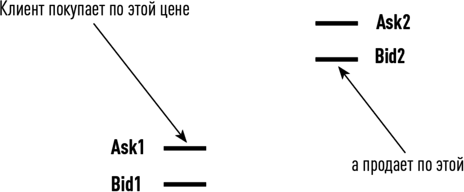 Как показано на рис. 2, клиент покупает евро за доллары по цене Ask1, спустя некоторое время евро подорожал и клиент решил продать евро и купить доллары. Продавать евро он будет по цене Bid2. Как изображено на рисунке, цена продажи Bid2 была больше, чем цена покупки Ask1, т. е. клиент купил дешево, а продал дорого, получив спекулятивную прибыль, определяемую разницей между Bid2 и Ask1.