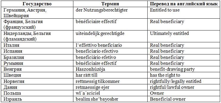 Итак, общепринятое внутреннее значение термина beneficial owner нельзя назвать определенным. Существует и дополнительная проблема: несоответствие международной языковой терминологии. Переводы термина с английского на другие языки государств, заключающих налоговые соглашения, не всегда в точности передают даже общепринятый смысл этих слов. Ниже приводится таблица терминов, обозначающих эквивалент англоязычного термина beneficial owner на языке этих государств, используемые в текстах налоговых соглашений, с одновременным дословным обратным переводом на английский язык[1612].