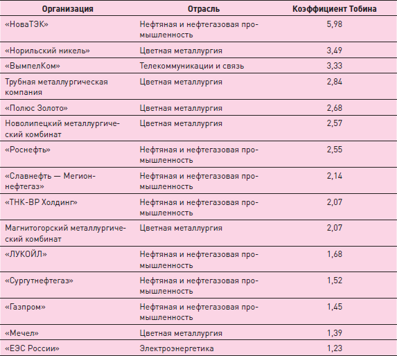 Таблица 2.3. Коэффициент Тобина в крупных российских организациях (данные на 29 марта 2007 г.)