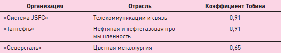 В компаниях «Система JSFC», «Татнефть», «Северсталь» резервы роста коэффициента Тобина значительны. Более эффективное использование ими информационных технологий, развитие корпоративного менеджмента позволит обеспечить существенный рост коэффициента Тобина.