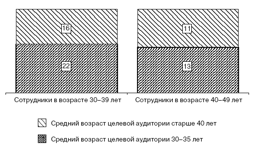 Рис. 3.23. Влияние возраста сотрудника на его представления о возрасте целевой аудитории, чел.