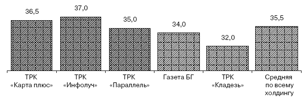 Существуют некие различия и на уровне отдельных бизнес-единиц холдинга. Например, сотрудники ТРК «Инфолуч» в среднем считают, что возраст их аудитории старше (37 лет), а сотрудники ТРК «Кладезь» – моложе (32 года). Любопытно, что представления сотрудников ТРК «Карта плюс» о возрасте аудитории мало чем отличаются от представлений ТРК «Инфолуч» (рис. 3.24). При этом известно, что в Соловьянинске существенно больше пенсионеров.