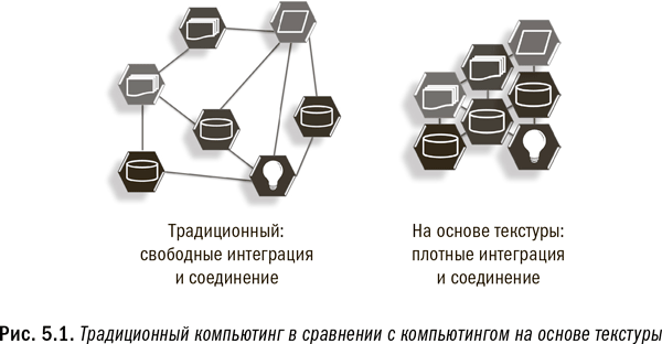 Создание традиционной системы EDW, функционирующей с точки зрения пользователя как единая машина, требует молниеносных соединений между входящими в нее машинами, а также сложного программного обеспечения для выполнения обработки. Такие соединения позволяют осуществлять масштабное перемещение данных, когда это необходимо (например, при объединении двух больших таблиц), и обеспечивают невероятно высокую скорость операций, когда перемещение данных не требуется. В отличие от этой концепции, которая объединяет машины с одинаковой конфигурацией, система на основе текстуры соединяет между собой различные типы платформ. Компьютинг на основе текстуры соединяет множество разных систем в одну большую логическую систему посредством высокоскоростных сетей, что позволяет любому компоненту взаимодействовать и обмениваться данными с любым другим компонентом текстуры. Многие люди приравнивают текстурный компьютинг к технологии Infiniband{44}, действующей гораздо быстрее, чем соединения в традиционных сетях. Однако эта сеть является всего лишь основой для аналитических процессов и соответствующего программного обеспечения по управлению процессами. На рис. 5.1 проиллюстрирована концепция построения компьютинга на основе текстуры.