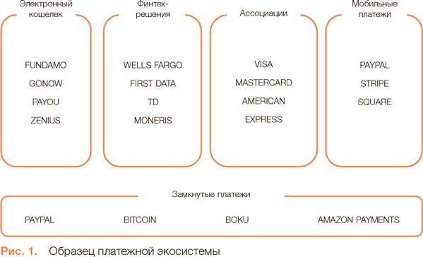 Строго говоря, существует несколько игроков в сфере платежей, которых можно классифицировать как электронные кошельки (Google Wallet, Visa Checkout, Apple Pay, Swap), банковские кредитные карты (Wells Fargo, HSBC, Chase), корпоративные кредитные карты (Best Buy, Target), платформы электронных кошельков (hyper Wallet, Fundamo, GoNow, Payou, Zenius), ассоциации (Visa, MasterCard, American Express), эквайеры (Wells Fargo, FirstData, TD, Moneris), процессинговые компании (Chase, GlobalPayments, FirstData), сторонние процессинговые компании (Stripe, PayPal, Square), ISO (Everlink, Pivotal Payments), терминалы торговой точки (Ingenico Group, Verifone, Magtek), интегрированные системы (Micros, Vivonet, Profitek), провайдеры магазинных платежных терминалов (Chase, Payfirma, GlobalPayments), провайдеры электронных платежей (Stripe, Payfirma, Apple Pay, PayPal), провайдеры повторных платежей (Stripe, PayPal, Payfirma), провайдеры мобильных платежей (Square, Venmo, Intuit), провайдеры терминалов для производства платежей в месте совершения покупки (Vend, NCR, Square, Payfirma).