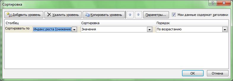 Шаг. 4. Щелкнем левой кнопкой мышки вверху рабочего листа Excel функции СОРТИРОВКА, после чего появится диалоговое окно СОРТИРОВКА. В этом окне после опции СОРТИРОВАТЬ ПО выбрать столбец «Индекс роста (снижения), а после опции ПОРЯДОК выбрать вариант ПО ВОЗРАСТАНИЮ – см. рис. 4.2.