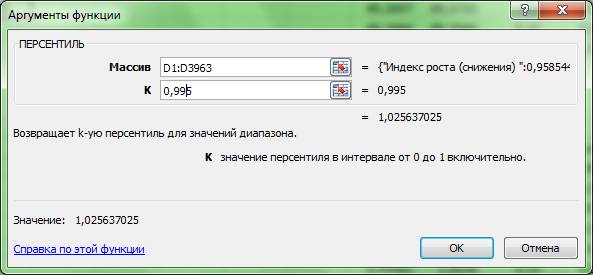 Шаг. 5. Для того чтобы найти величину стоп-лоссов и тейк-профитов с желательной для трейдера вероятностью их срабатывания необходимо воспользоваться в Excel функцией ПЕРСЕНТИЛЬ. Для тех читателей, кто не знает, скажу, что перцентилем (или процентилем) в математической статистике называется такое число, которое заданная случайная величина не превышает его с фиксированной вероятностью. Поскольку индексы роста (снижения) во много зависят от воздействия случайной компоненты, то мы можем, например, поставить перед собой задачу: установить такой уровень стоп-лосса и тейк-профита, чтобы вероятность их срабатывания не превысила 1,0%.