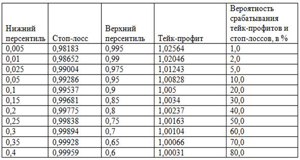 Таблица 4.2. Стоп-лоссы и тейк-профиты с различной вероятностью их срабатывания