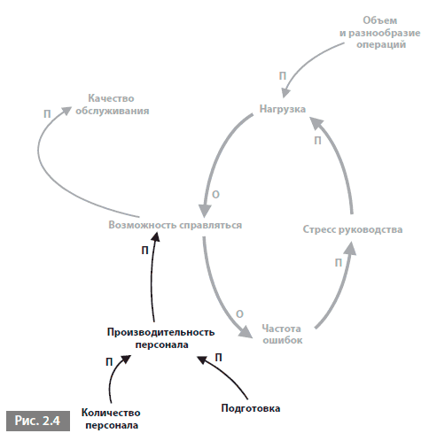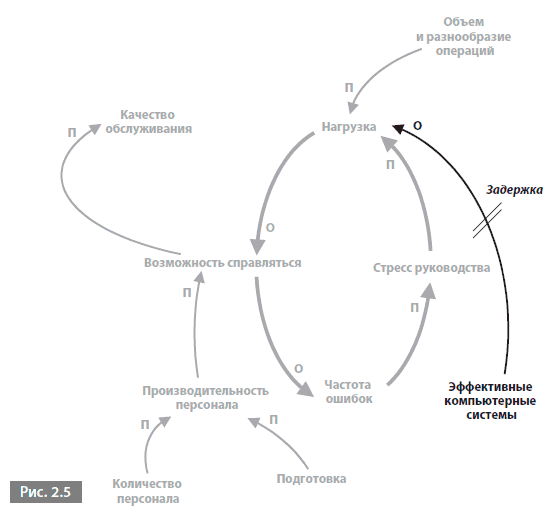 Большинство причинно-следственных связей имеет задержку во времени, так как действие очень редко приводит к мгновенному результату. Вероятно, вы думаете, что на обучение людей требуется время (что подразумевает задержку между обучением и эффективной работой персонала), а на поиск хороших специалистов – еще больше времени (еще одна задержка). Тогда почему я ввел задержку между эффективными компьютерными системами и нагрузкой, а не в другом месте? Потому что задержки есть везде, но эта имеет особую важность.