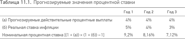 Существует два подхода к процессу прогнозирования краткосрочных процентных ставок: или а) допущения могут быть сделаны непосредственно по самой ставке, или б) могут быть использованы «реальные» процентные ставки (то есть процентная ставка после учета инфляции), и фактическая процентная ставка определяется на основании ставки индекса потребительских цен. В последнем случае, как это представлено в табл. 11.1, если используется реальная процентная ставка, скажем в 4 %, то прогнозируемая номинальная процентная ставка – это реальная процентная ставка, скорректированная с учетом коэффициента инфляции на основании «формулы Фишера».