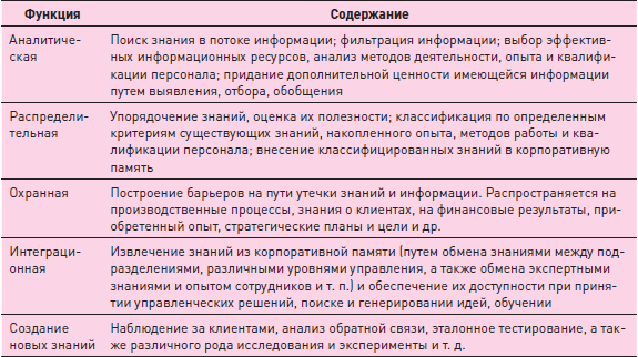 В общем виде управление знаниями включает в себя функции по обеспечению персонала необходимыми знаниями и их применению, контролю над их использованием, а также по организации хранения и распространения знаний (табл. 3.4).
