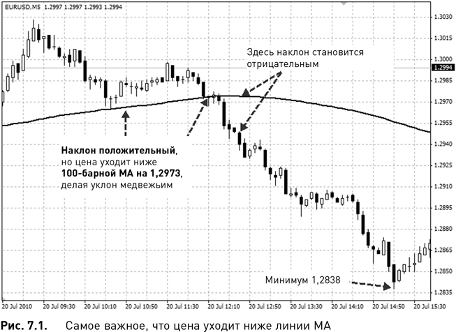 Например, на рис. 7.1 100-барная MA, изображенная на графике сплошной линией, имеет положительный наклон. Однако когда цена уходит ниже скользящей средней линии на 1,2973, это делает уклон медвежьим. Рынок развивает нисходящий тренд и достигает дна на 1,2838.