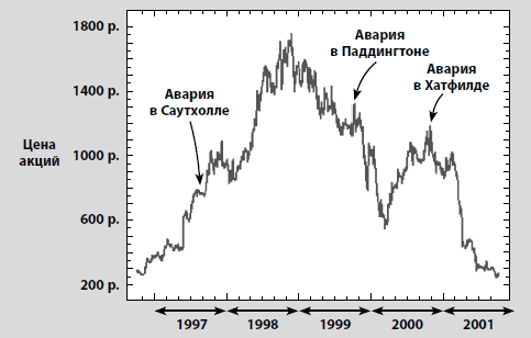 Затем произошел ряд аварий. Первая, в 1997 г. в Саутхолле, не повлекла серьезных последствий, так как общественность понимает, что время от времени несчастные случаи происходят. Вторая авария, на Паддингтонском вокзале в 1999 г., вызвала более широкий общественный резонанс, а авария в Хатфилде всего год спустя переполнила чашу терпения. Она не просто потрясла пассажиров поездов – ведь они рассчитывали на безопасность перевозок. Надежность обслуживания резко пошла на спад, и база довольных клиентов сократилась. Внезапно доход от продаж упал, прибыль исчезла, шансы на получение средств для инвестиций без помощи правительства были ничтожны…