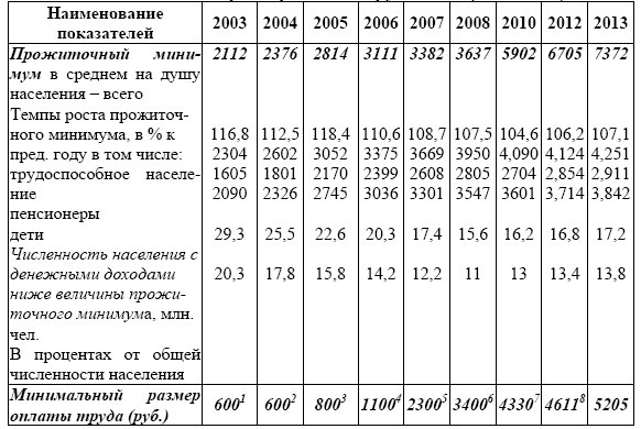 Величина прожиточного минимума, уровень бедности населения и минимальный размер оплаты труда в РФ (2003–2013)[4]