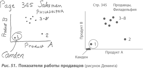 Вернемся к «Выходу из кризиса», где на стр. 301–302 идет обсуждение действий восьми продавцов на двух продуктовых линиях (скажем, А и В) в районе Филадельфии. Для прояснения аргументации Деминг рисует диаграмму (пропущенную в его книге). Рисунок 51 – это копия одного из его эскизов для проектора. Ясно, что продавец № 1 «не тянет». Почему? В результате анализа выяснилось, что его территория – это Камден. «Пытались ли вы когда-нибудь продавать что-либо в Камдене?» – спрашивает Деминг. Продавец № 1, вполне возможно, был самым усердным тружеником из всех восьми и все же при использовании любой системы оплаты, основанной на комиссионных, не смог бы заработать себе даже на пропитание. Также оказалось, что существует множество объективных причин для объяснения того, почему продукт В не продается как следует на территории продавца № 2.