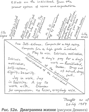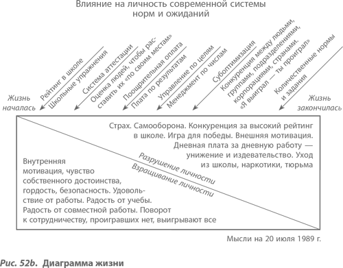 Я завершу эту главу одним из недавних подарков Деминга. Я называю это «диаграмма жизни», и она приведена на рисунке 52. Как это часто бывает, Деминг просто берет в руки карандаш и бумагу, а в результате мы наблюдаем богатство и полноту мысли. На рисунке мы видим время, проходящее по диагонали листа, от рождения (вверху слева) до смерти (внизу справа). Мы видим, что рождение ребенка открывает перед ним целый мир. Он получает полный потенциал внутренней мотивации, любознательности, достоинства, радости, доброжелательности. Но что происходит дальше? Он оказывается под кованым сапогом традиционного образования и системы менеджмента: ранжирования, конкуренции, оплаты по результатам, управления по целям, порочной практики – всего того, что противоречит пунктам 11 и 12 и философии Деминга в целом. В результате прекрасный потенциал, которым ребенок наделен с рождения, постепенно сходит на нет и разрушается, чтобы замениться плодами конкурентного эгоистичного общества, основанного на внешней мотивации: