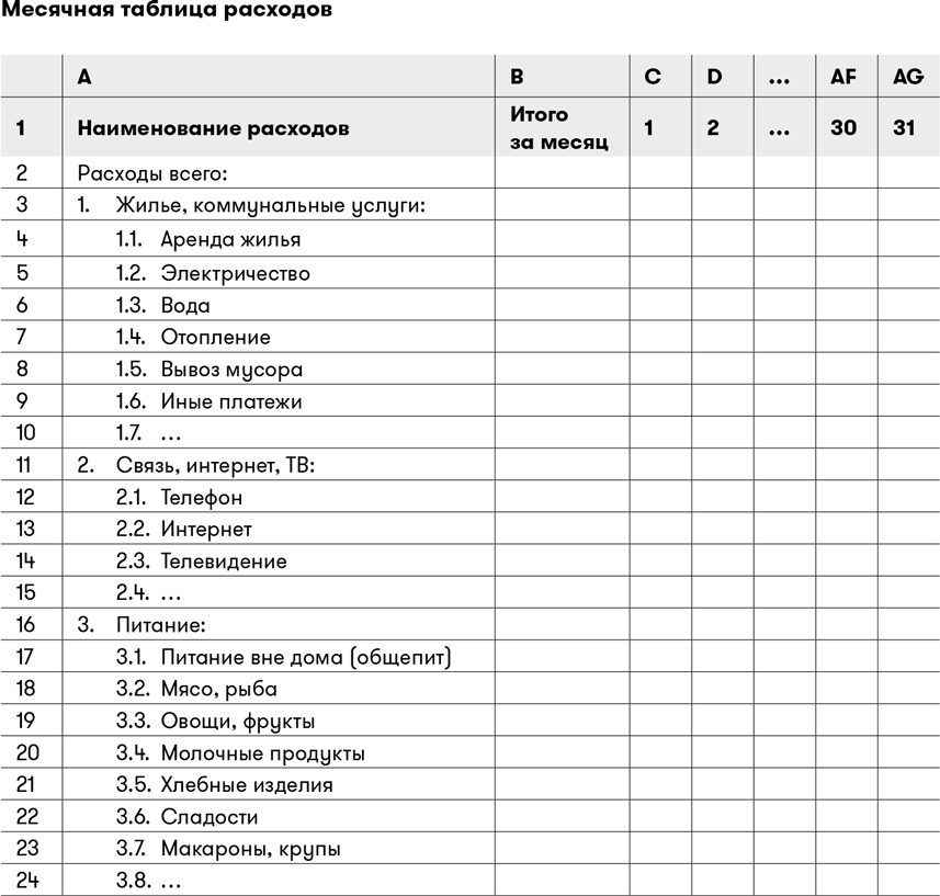 Вышеприведенная таблица рассчитана на ведение ежедневных записей ваших расходов в течение одного месяца. Вам не нужно будет вручную суммировать месячные расходы по той или иной статье. Электроника сделает это за вас.