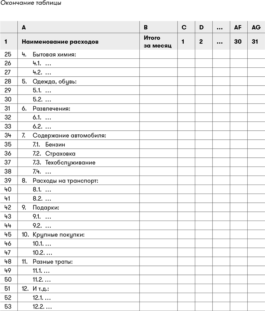 Путем несложных манипуляций электронная таблица настраивается таким образом, чтобы в каждой ячейке столбца B «Итого за месяц» автоматически суммировались значения ячеек столбцов с C по AG, то есть всех дней месяца. Например, в ячейке B35 автоматически будет высчитываться сумма ваших расходов на бензин с 1-го по 31-е число месяца (сумма всех ячеек с C35 по AG35).