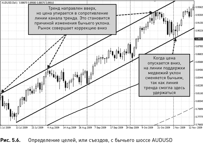 На рис. 5.6 изображен восходящий тренд рынка AUDUSD. Построен канал, соединяющий минимумы и максимумы. Верхняя линия тренда становится целью бычьего шоссе. Когда цена достигает этой цели, или съезда, моментум рынка тормозит, и цена разворачивается. Это медвежий признак. Цена не может проехать мимо съезда, поэтому машина на шоссе останавливается, и она может только развернуться и поехать в другую сторону. Трейдеры могут продавать на этом уровне с определенным риском. Если цена пойдет выше линии тренда, длинную позицию можно восстановить. Если цена пойдет вниз, значит, уклон теперь медвежий, и целью этого медвежьего движения становится нижняя линия тренда.